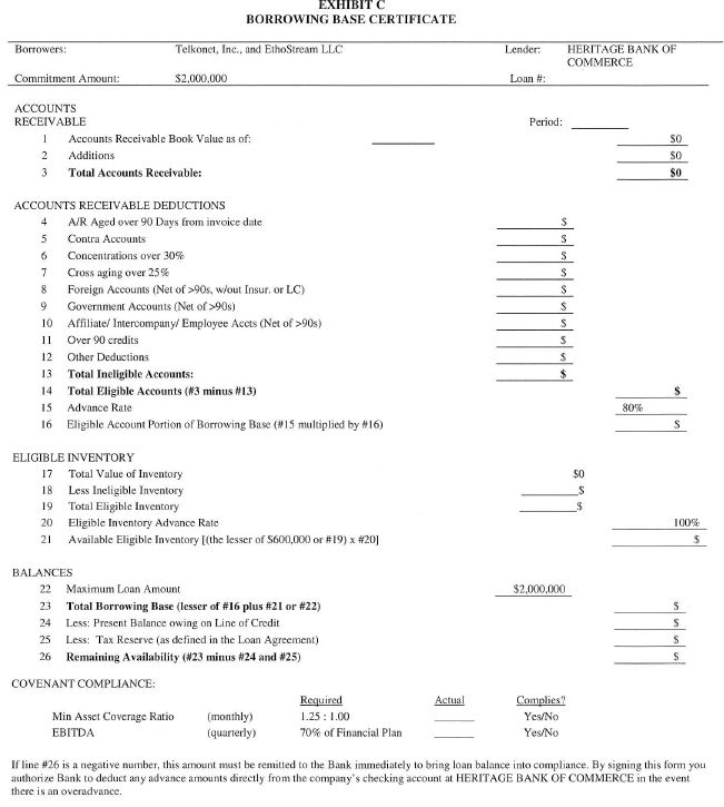 The undersigned authorized officer of TELKONET, INC. on behalf of all Borrowers, hereby certifies that in accordance with the terms and conditions of the Loan and Security Agreement between Borrowers and Bank (the “Agreement”), (i) each Borrower is in complete compliance for the period ending _______________ with all required covenants except as noted below and (ii) all representations and warranties of each Borrower stated in the Agreement are true and correct as of the date hereof. Attached herewith are the required documents supporting the above certification. The Officer further certifies that these are prepared in accordance with Generally Accepted Accounting Principles (GAAP) and are consistently applied from one period to the next except as explained in an accompanying letter or footnotes.
