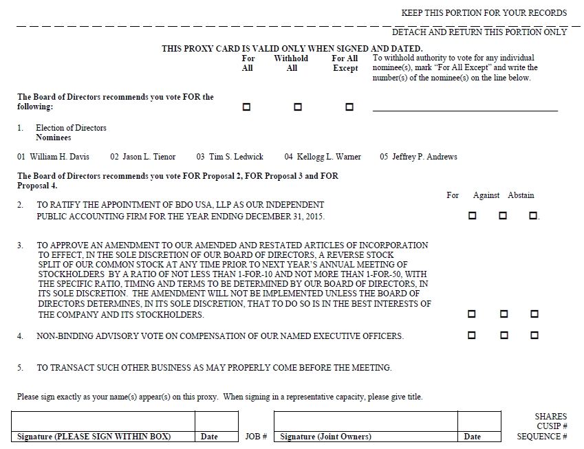 Your vote is important. Even if you plan to attend the Meeting in person, the Company requests that you sign and return the enclosed proxy, or vote by telephone or over the Internet as instructed in these materials, as promptly as possible to ensure that your shares will be represented at the Meeting if you are unable to attend. If you sign, date and mail your proxy card without indicating how you wish to vote, your proxy will be counted as a vote FOR each of the nominees for director, FOR the ratification of BDO USA, LLP as our independent registered public accounting firm for the year ending December 31, 2015, FOR the approval of an amendment to our Amended and Restated Articles of Incorporation to effect, in the sole discretion of our Board of Directors, a reverse stock split of our common stock, FOR the non-binding advisory approval of the compensation of our named executive officers, and in the discretion of management on any other matter which may properly come before the Meeting. If you do attend the Meeting and wish to vote in person, you may withdraw your proxy and vote in person. Please note, however, that if your shares are held of record by a broker, bank, or other nominee and you wish to vote at the Meeting, you must obtain from the record holder a proxy issued in your name.