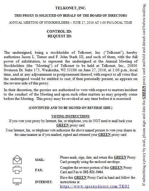 Our proxy statement and GREEN proxy card are enclosed along with our Annual Report on Form 10-K for the year ended December 31, 2015, which is being provided as our Annual Report to Stockholders. These materials are also available on the following website at https://www.iproxydirect.com/TKOI. If you have any questions about the annual meeting, or require assistance in submitting your proxy or voting your shares or need additional copies of the accompanying proxy statement or the GREEN proxy card, please contact Investor Relations at ir@telkonet.com or call 414-223-0473. If your broker or other nominee holds your shares, you also should call your broker or other nominee for additional information.