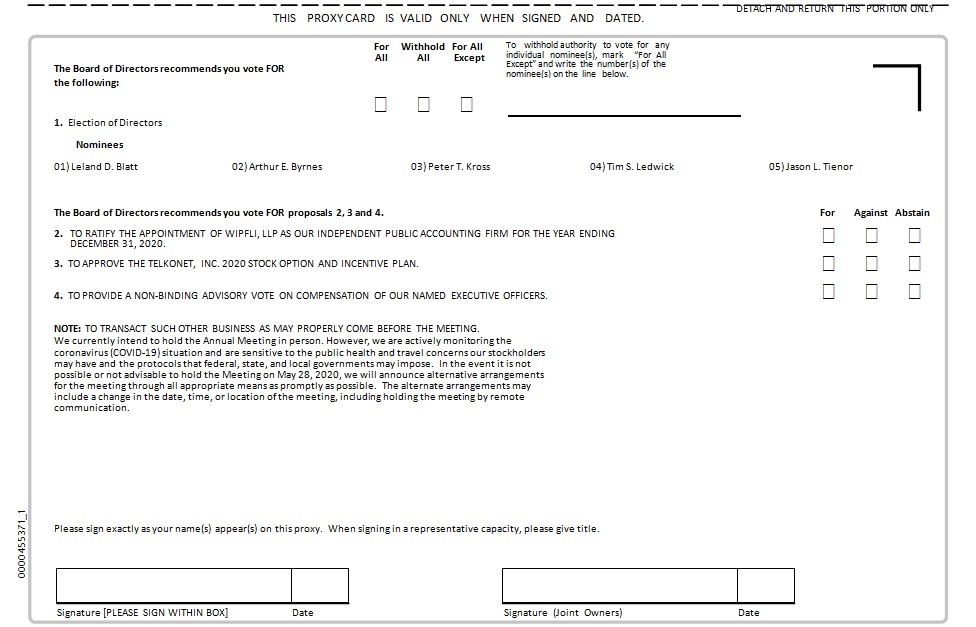 At the Meeting, and at any postponements and adjournments thereof, all shares entitled to vote and represented by properly executed proxies received prior to the Meeting and not revoked will be voted as instructed on those proxies. If no instructions are indicated on a properly executed proxy, the shares will be voted “FOR” each of the nominees for director, “FOR” the ratification of Wipfli LLP as our independent registered public accounting firm for the year ending December 31, 2020, “FOR” the approval of the Telkonet, Inc. 2020 Stock Option and Incentive Plan (the “2020 Plan”), “FOR” the non-binding advisory approval of the compensation of our named executive officers, and in the discretion of the proxies on any other matter which may properly come before the Meeting.