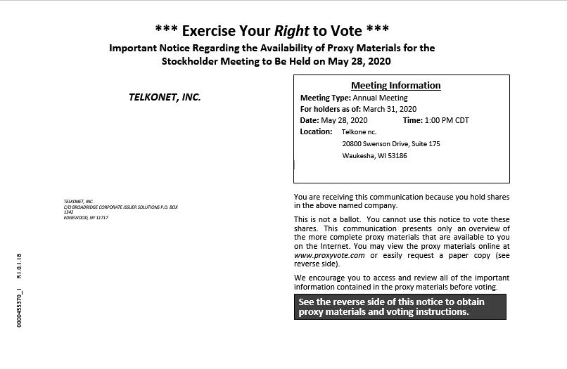 0000455 3 70_1 R 1.0.1. 1 8 *** Exercise Your Right to Vote *** Important Notice Regarding the Availability of Proxy Materials for the Stockholder Meeting to Be Held on May 28, 2020 TELKONET, INC. TELKONET, INC. C/O BROADRIDGE CORPORATE ISSUER SOLUTIONS P.O. BOX 1342 EDGEWOOD, NY 11717 Meeting Information Meeting Type: Annual Meeting For holders as of: March 31, 2020 Date: May 28, 2020 Time: 1:00 PM CDT Location: Telkone nc. 20800 Swenson Drive, Suite 175 Waukesha, WI 53186 You are receiving this communication because you hold shares in the above named company . This is not a ballot . You cannot use this notice to vote these shares . This communication presents only an overview of the more complete proxy materials that are available to you on the Internet . You may view the proxy materials online at www . proxyvote . com or easily request a paper copy (see reverse side) . We encourage you to access and review all of the important information contained in the proxy materials before voting . See the reverse side of this notice to obtain proxy materials and voting instructions.