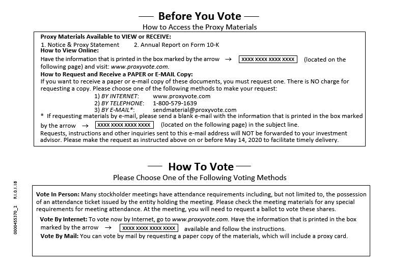 0000455 3 70_2 R 1.0.1. 1 8 Before You Vote How to Access the Proxy Materials Proxy Materials Available to VIEW or RECEIVE: 1. Notice & Proxy Statement 2. Annual Report on Form 10 - K How to View Online: Have the information that is printed in the box marked by the arrow following page) and visit: www.proxyvote.com. How to Request and Receive a PAPER or E - MAIL Copy: (located on the If you want to receive a paper or e - mail copy of these documents, you must request one. There is NO charge for requesting a copy. Please choose one of the following methods to make your request: 1) BY INTERNET : 2) BY TELEPHONE : w w w .prox yv ot e . c om 1 - 800 - 579 - 1639 3) BY E - MAIL* : sendmaterial@proxyvote.com * If requesting materials by e - mail, please send a blank e - mail with the information that is printed in the box marked by the arrow (located on the following page) in the subject line. Requests, instructions and other inquiries sent to this e - mail address will NOT be forwarded to your investment advisor. Please make the request as instructed above on or before May 14, 2020 to facilitate timely delivery. How To Vote Please Choose One of the Following Voting Methods Vote In Person: Many stockholder meetings have attendance requirements including, but not limited to, the possession of an attendance ticket issued by the entity holding the meeting. Please check the meeting materials for any special requirements for meeting attendance. At the meeting, you will need to request a ballot to vote these shares. Vote By Internet: To vote now by Internet, go to www.proxyvote.com. Have the information that is printed in the box marked by the arrow available and follow the instructions. Vote By Mail: You can vote by mail by requesting a paper copy of the materials, which will include a proxy card.
