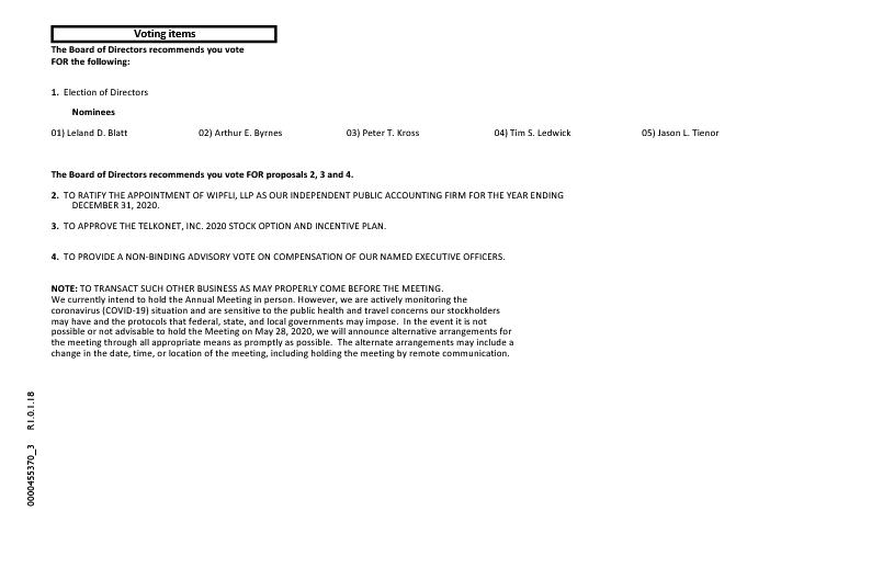 0000455 3 70_3 R 1.0.1. 1 8 Voting items The Board of Directors recommends you vote FOR the following: 1. Election of Directors Nominees 01) Leland D. Blatt 02) Arthur E. Byrnes 03) Peter T. Kross 04) Tim S. Ledwick 05) Jason L. Tienor The Board of Directors recommends you vote FOR proposals 2, 3 and 4. 2. TO RATIFY THE APPOINTMENT OF WIPFLI, LLP AS OUR INDEPENDENT PUBLIC ACCOUNTING FIRM FOR THE YEAR ENDING DECEMBER 31, 2020. 3. TO APPROVE THE TELKONET, INC. 2020 STOCK OPTION AND INCENTIVE PLAN. 4. TO PROVIDE A NON - BINDING ADVISORY VOTE ON COMPENSATION OF OUR NAMED EXECUTIVE OFFICERS. NOTE: TO TRANSACT SUCH OTHER BUSINESS AS MAY PROPERLY COME BEFORE THE MEETING. We currently intend to hold the Annual Meeting in person. However, we are actively monitoring the coronavirus (COVID - 19) situation and are sensitive to the public health and travel concerns our stockholders may have and the protocols that federal, state, and local governments may impose. In the event it is not possible or not advisable to hold the Meeting on May 28, 2020, we will announce alternative arrangements for the meeting through all appropriate means as promptly as possible. The alternate arrangements may include a change in the date, time, or location of the meeting, including holding the meeting by remote communication.