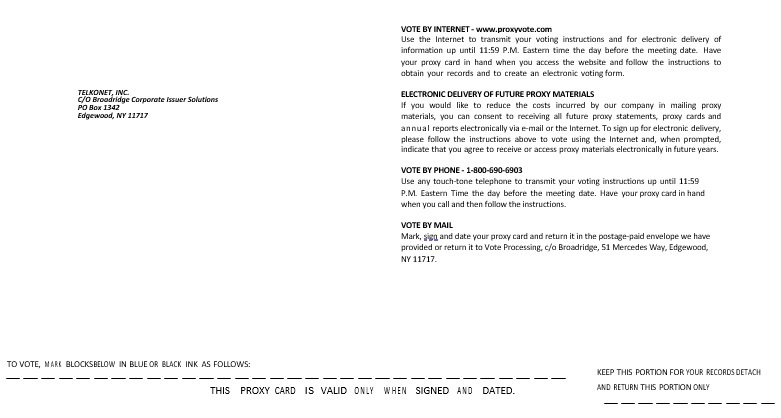| 1. | approve an amendment to Telkonet’s Amended and Restated Articles of Incorporation to increase the authorized shares of Common Stock of Telkonet from 190,000,000 shares to 475,000,000 shares; |