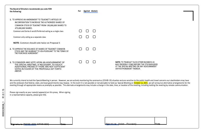 | 2. | to approve the issuance of shares of Telkonet Common Stock and the Warrant and Warrant Shares (as defined in the accompanying proxy statement) to VDA Group S.p.A., an Italian joint stock company (“VDA”) pursuant to the terms of the Stock Purchase Agreement, dated as of August 6, 2021, between Telkonet and VDA; |