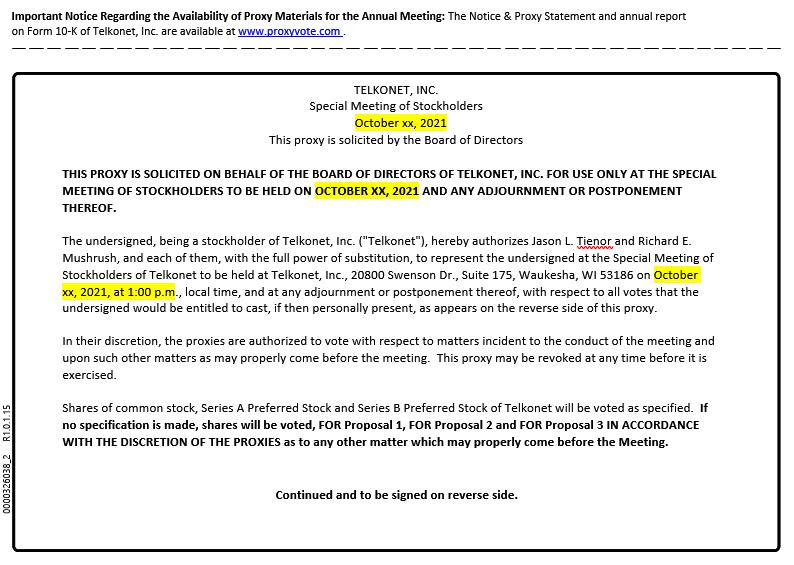 Notice is hereby given that a special meeting of stockholders (the “Special Meeting”) of Telkonet, Inc., a Wisconsin corporation (“Telkonet,” the “Company,” “we,” “us,” or “our”), will be held on [●], 2021, at [●] [a.m.], Central time, at the principal executive offices of Telkonet, 20800 Swenson Drive, Suite 175, Waukesha, Wisconsin 53186. At the Special Meeting, Telkonet stockholders will be asked to consider and vote upon the following proposals: