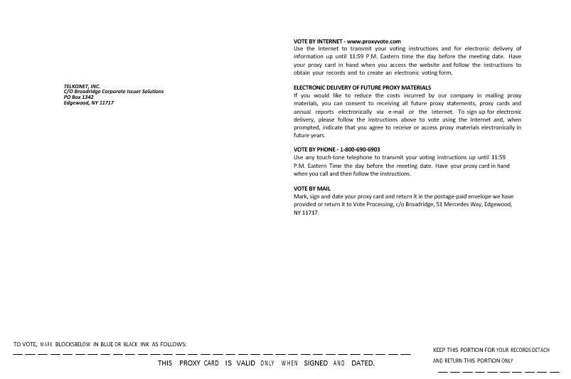 | 1. | approve an amendment to Telkonet’s Amended and Restated Articles of Incorporation to increase the authorized shares of Common Stock of Telkonet from 190,000,000 shares to 475,000,000 shares; |