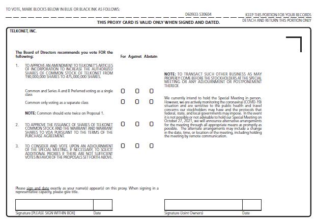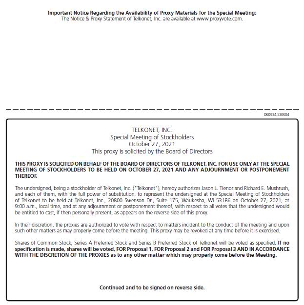 We encourage you to review all of the information contained in the proxy statement and accompanying materials before voting. This notice is not a form for voting and presents only an overview of the more complete proxy materials, which contain important information. If you would like to receive additional paper or email copies of the proxy materials at no charge, or if you would like information about how to attend the Special Meeting in person, please contact Laurel Hill Advisory Group LLC at (888) 742-1305 or telkonet@laurelhill.com on or before October 20, 2021, to facilitate timely delivery.