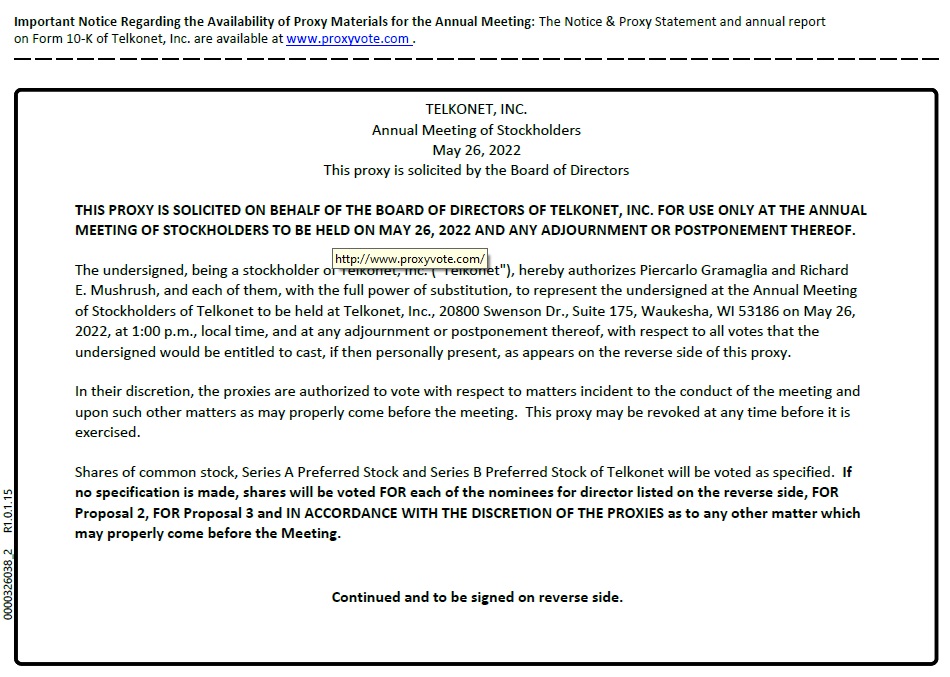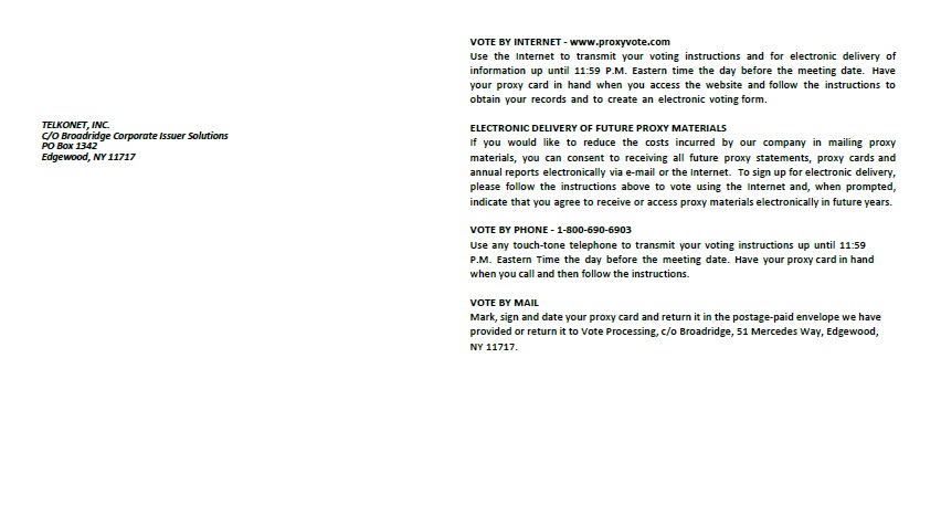 Whether or not you plan to attend the meeting, we urge you to complete, date and sign the enclosed proxy card and return it at your earliest convenience. No postage need be affixed if you use the enclosed envelope and it is mailed in the United States. You may also vote by telephone or via the Internet. If you have any questions or need assistance in completing the proxy card or voting by telephone or via the Internet, please contact Investor Relations at ir@telkonet.com or call 414-302-2299.