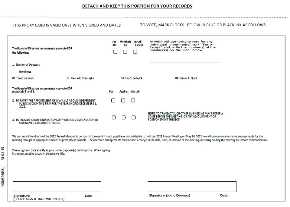 | 2. | To ratify the appointment of Wipfli LLP as our independent registered public accounting firm for the year ending December 31, 2022; | |